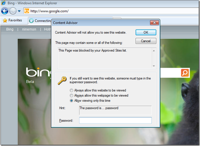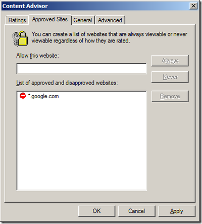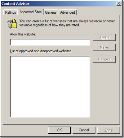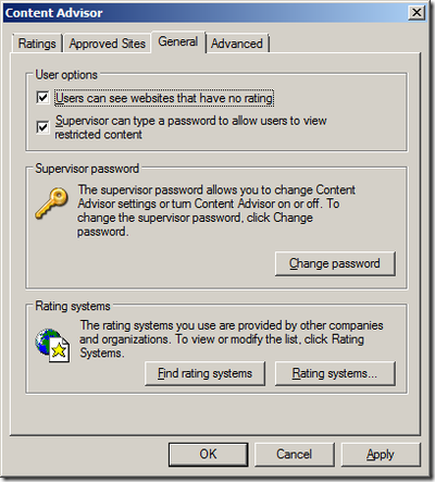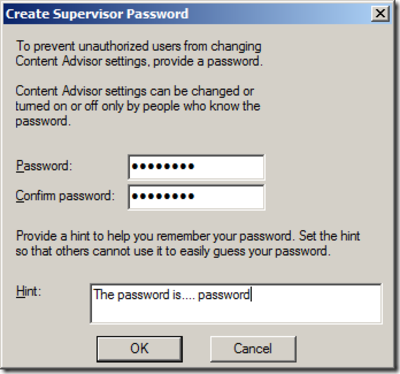 From the example above, the hint is a little silly. You might want to type a Hint that suggests contacting an administrator to get the password. One more major issue: By default when you enable the content advisor it will automatically block any web site that does not have a rating configured. We need to fix that. Tick “User can see websites that have no rating” then click “OK” as seen below: